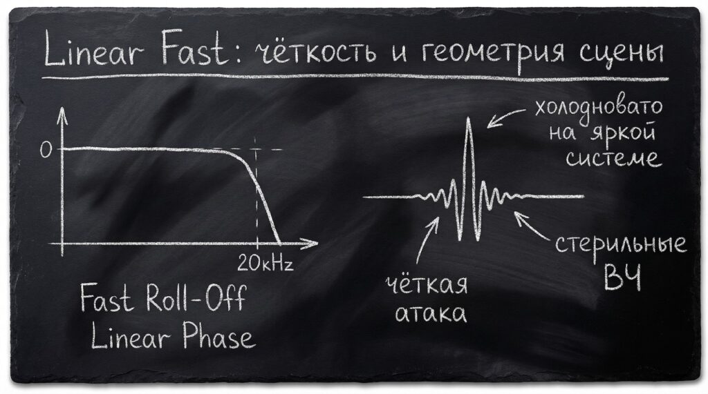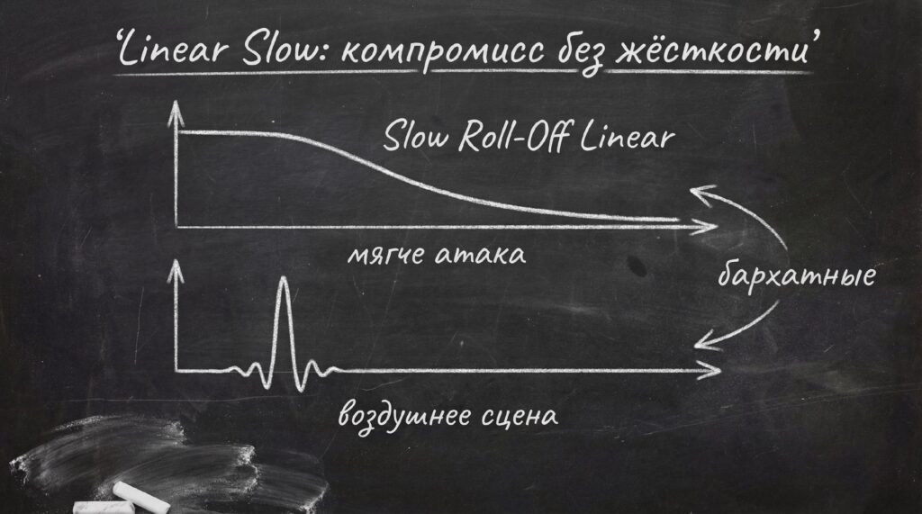 • Переход с linear fast → linear slow: звук становится мягче, ВЧ менее колючие, атака чуть сглажена, сцена ощущается свободнее.