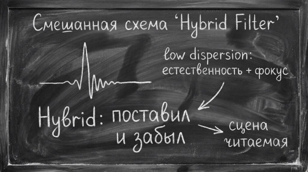 Многие современные ЦАП добавляют промежуточные варианты — «Hybrid», «Low dispersion», «Mixed phase». Идея — сочетать чуть нелинейную фазу (чтобы уменьшить предзвон) с не слишком большим искажением временной структуры.