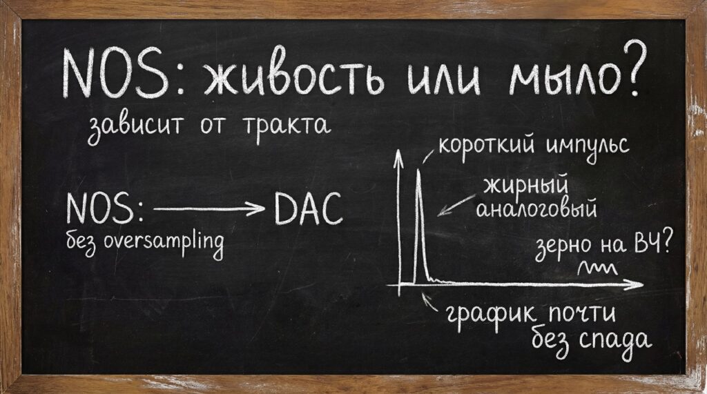 Объективно NOS добавляет больше ультразвука, который может взаимодействовать с усилителем и АС, поэтому поведение конкретного тракта у всех будет разным. На некоторых системах это даёт «магическую» музыкальность, на других — мыло и потерю разрешения.
