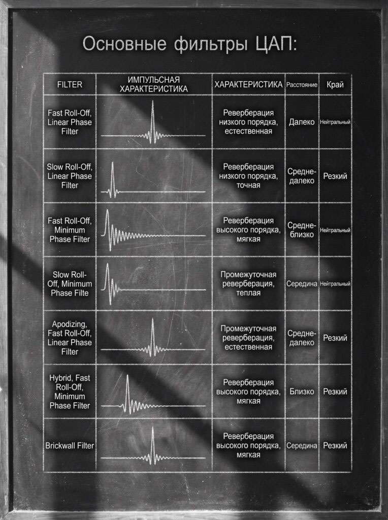 • Яркая система, сибилянты, «цифра режет» — minimum phase slow, minimum phase fast, apodizing, иногда hybrid.