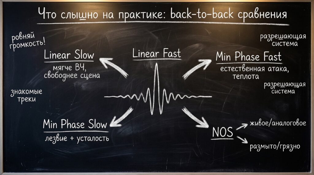 Типичные субъективные эффекты: звук воспринимается чуть мягче, чем с fast roll-off. Атака не такая острая, щипок струн и тарелки немного сглажены. ВЧ — более деликатные, часто менее навязчивые. На нейтральных или ярких АС/наушниках многие описывают как более «аналоговое» или «музыкальное» звучание. Сцена чуть шире и «воздушнее», при этом локализация предметов может быть каплю менее «высечена в граните».