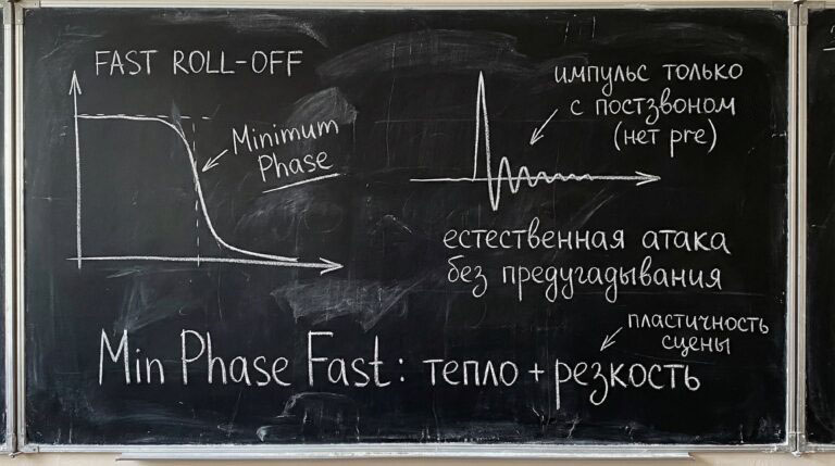 На ярких трактах minimum phase fast roll-off нередко помогает убрать ощущение «цифрового лезвия», сохраняя при этом хорошую читаемость деталей.