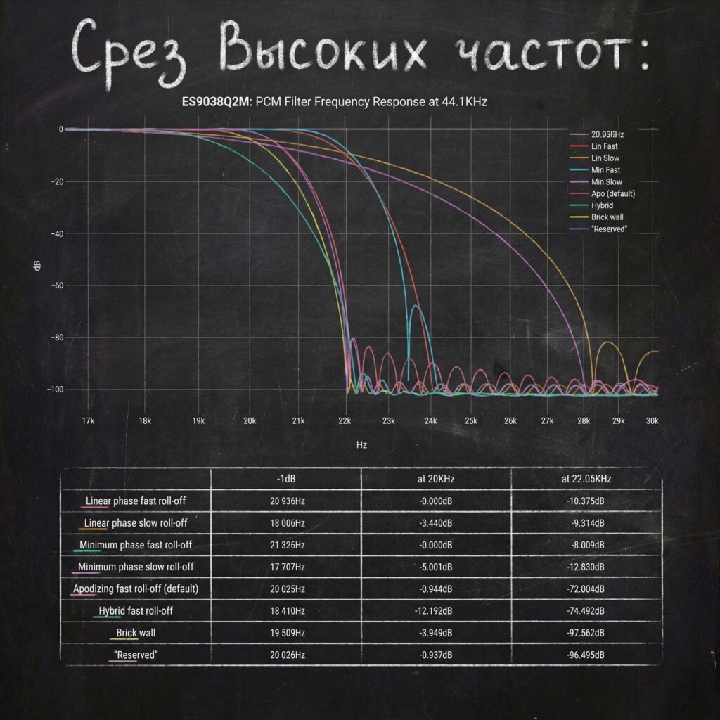 Иногда отдельным пунктом: максимально крутой спад с жёсткой «стенкой» около Найквиста, заточенный на подавление ультразвука до измерительного идеала.