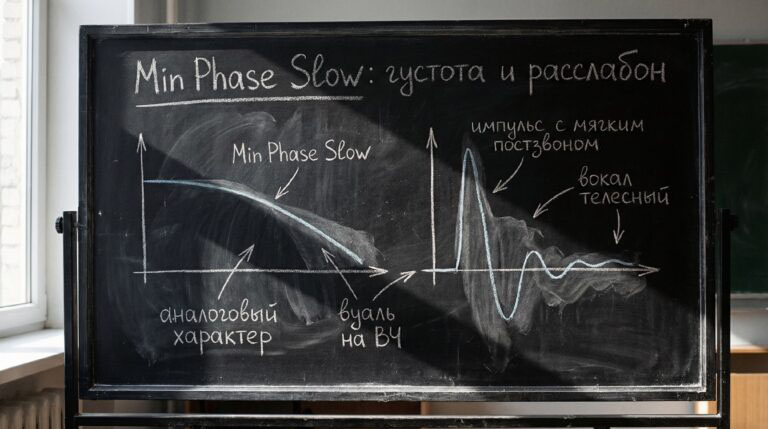 Субъективные впечатления обычно такие: подача более естественная, чем у чистого линейного brickwall, но и не такая расслабленная, как у minimum phase slow. ВЧ достаточные по количеству, но без сильной стерильности; «песок» на тарелках появляется реже. Сцена сохраняет приличную фокусировку и читаемость, не превращаясь в «туман».
