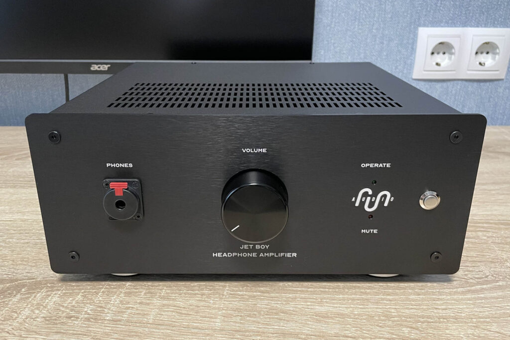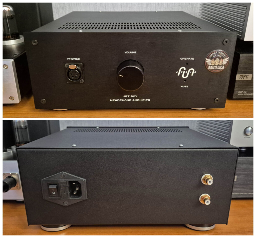 Шасси выполнено из довольно толстой стали, дизайн передней панели лаконичен, со светодиодным индикатором автоматической задержки включения. Тумблер и разъём питания совмещены и расположены сзади. Отдельно хочу отметить широченные ножки, обеспечивающие хорошую виброразвязку с поверхностью. Объективных минусов два: некоторые рёбра корпуса островаты, а чёрные винты оказались весьма посредственного качества и быстро слизываются (в тестовом экземпляре они заменены на прочные оцинкованные). В целом Jet Boy смотрится как добротное мелкосерийное устройство с упором больше на лаконичность, чем на дизайн.