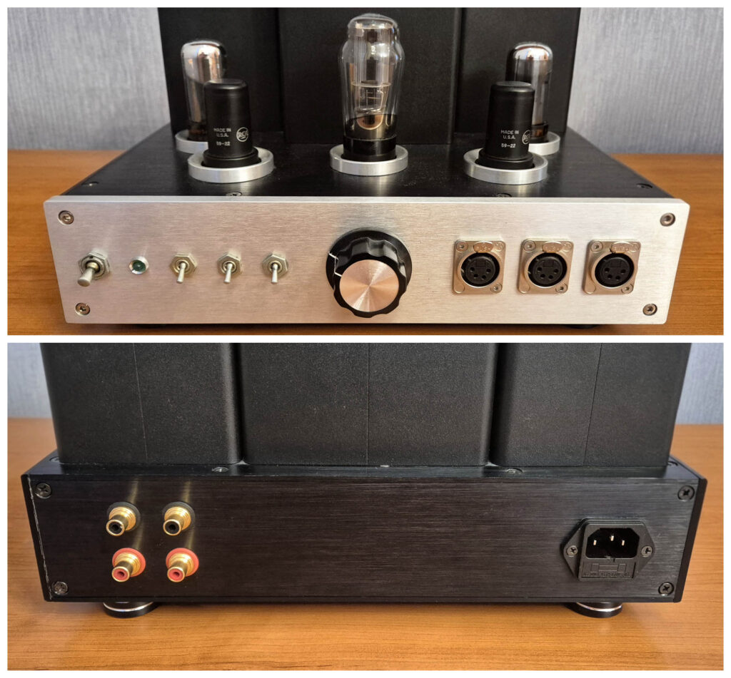 Hi-End Сочи собран в алюминиевом OEM-корпусе с внешним монтажом радиоламп. Дизайн и расположение элементов управления на передней панели были спроектированы мной. Три мелких тумблера отвечают за выбор Триод—Тетрод, отключение и включение ОООС, изоляцию и коммутацию выходных разъёмов в цепи усиления (Mute—Operate). Гнёзда 4-pin XLR (с несимметричной разводкой) позволяют напрямую подключать наушники к наиболее соответствующему их импедансу отводу ТВЗ. 15-омный отвод запараллелен на выходные RCA в качестве функционального аналога предусилителя и оптимизирован таким образом, чтобы не оказывать негативное влияние на звук в наушниках.