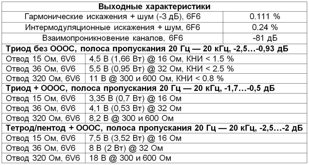 Отводы вторичных обмоток ТВЗ рассчитаны на нагрузку 15, 36 и 320 Ом. Таким образом, усилитель оптимально работает с довольно тугими магнито-планарными наушниками импедансом примерно 13—72 Ом и динамическими — импедансом 250—600 Ом. Реализованы два основных рабочих режима: «Триод без общей отрицательной обратной связи» (далее — ОООС), «Тетрод/пентод + ОООС»; и один побочный, рассчитанный на высокочувствительные низкоомные наушники — «Триод + неглубокая ОООС».