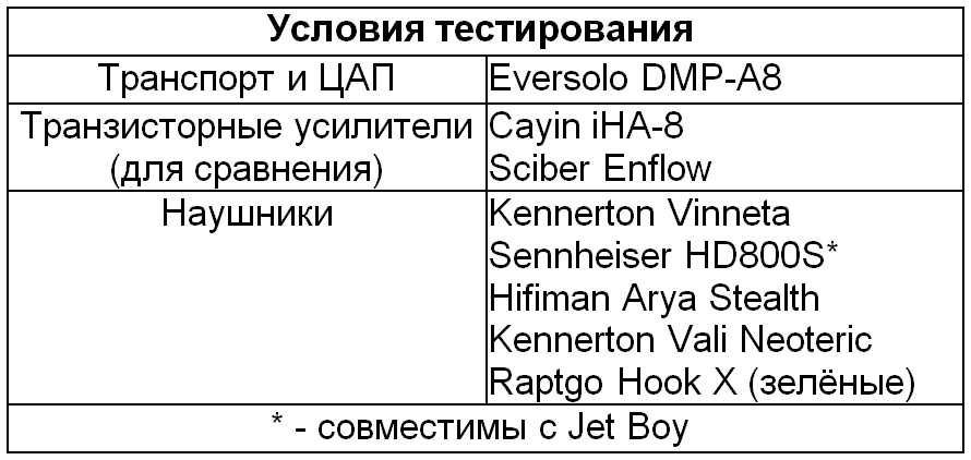 Jet Boy проектировался для динамических наушников импедансом 100—600 Ом. Теоретически можно подключить меньшее сопротивление, но выходное напряжение усилителя заметно упадёт. К тому же он не выдаст необходимый ток для раскачки магнито-планаров и исказит тональную настройку низкоомных динамиков с частотно-зависимым переменным импедансом. И это не ошибка проектирования: подобным образом ведут себя практически все ламповые OTL-усилители.